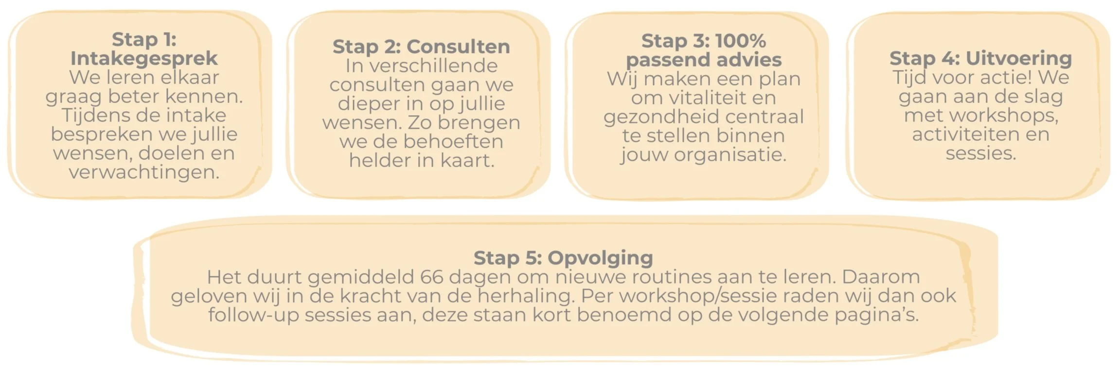 Aan de hand van vier stappen stellen wij concrete, vitale doelen op die aansluiten op het bedrijf. De categorieën van onze “Holy Five” worden hierin meegenomen. Vervolgens wordt er een actieplan gemaakt en gaan we dit uitvoeren met tussentijdse evaluaties.